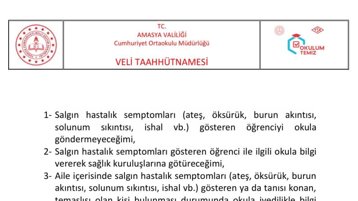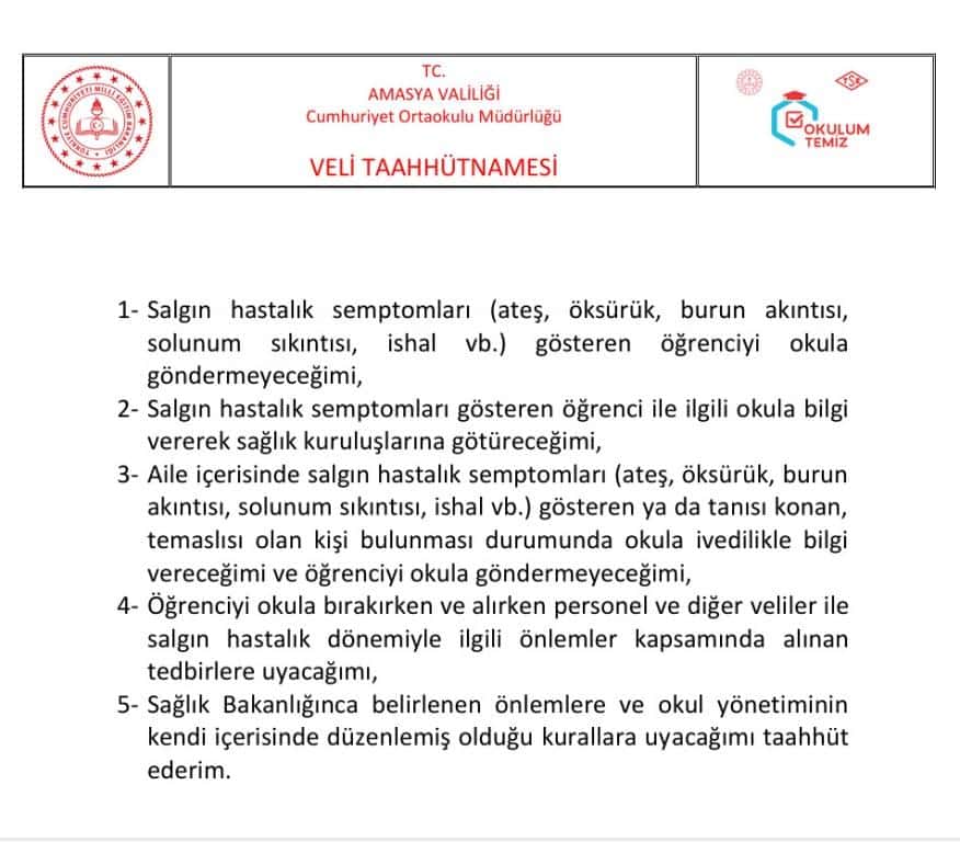 Okulum temiz projesi kapsamında velilerimiz için Taahhütname